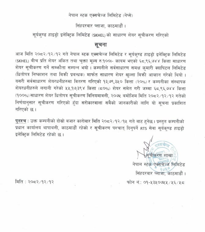 Seen here are representatives from Suryakunda Hydro Electric Limited (SKHEL) and NEPSE, formalizing the agreement to list 68,96,744 units of our shares. This agreement, signed today, March 26, 2026, paves the way for trading to begin on Sunday.