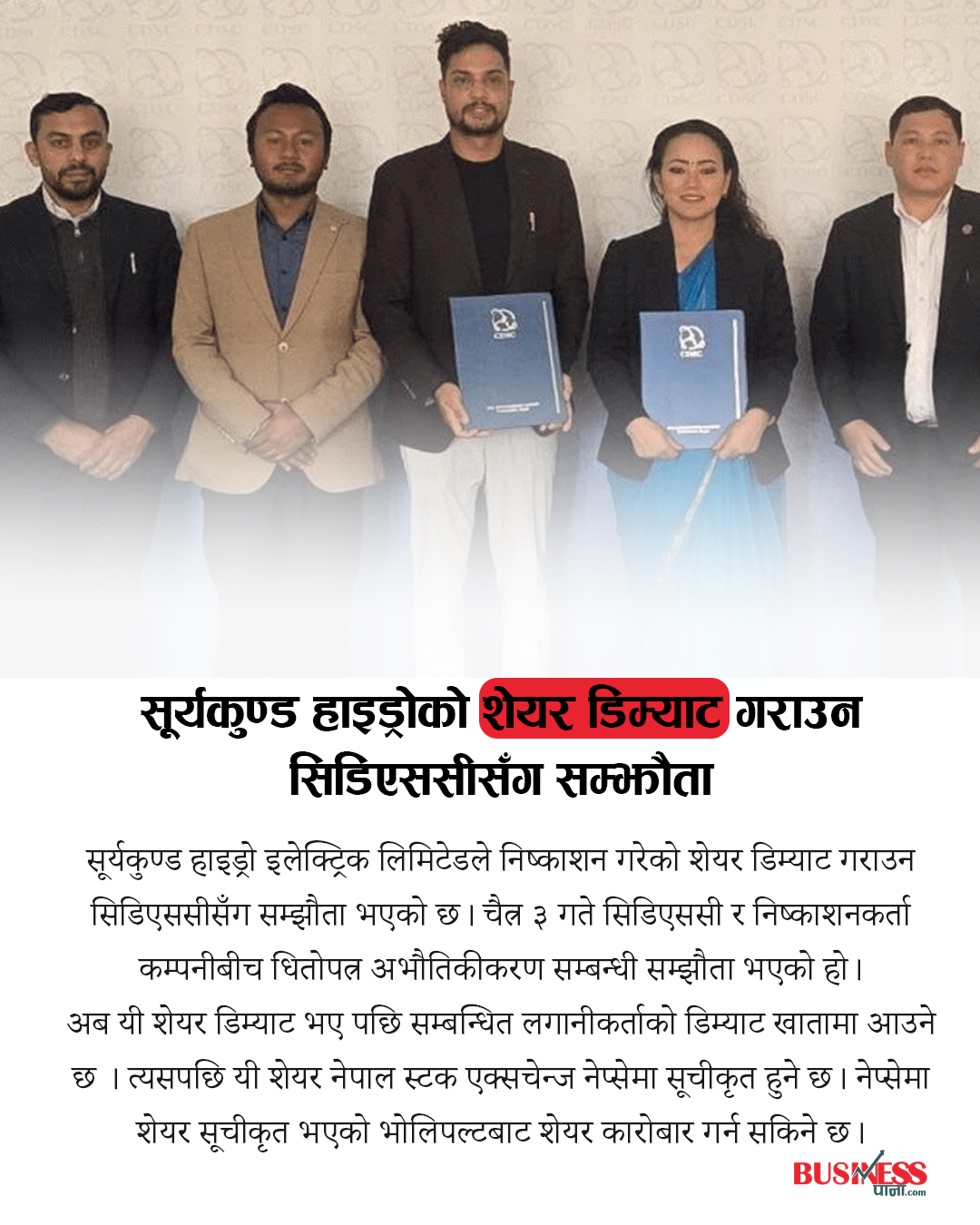 सूर्यकुण्ड हाइड्रो इलेक्ट्रिक लिमिटेडले निष्काशन गरेको शेयर डिम्याट गराउन सिडिएससीसँग सम्झौता भएको छ। चैत्र ३ गते सिडिएससी र निष्काशनकर्ता कम्पनीबीच धितोपत्र अभौतिकीकरण सम्बन्धी सम्झौता भएको हो।